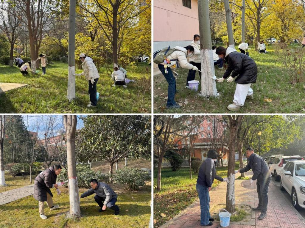 在后勤保障部负责老师的指导下,大家迅速分组、明确分工,领取劳动工具,有序投入到为树木“穿冬衣”的工作中。从树木根茎处的规范涂刷,到高度的一致统一,党员同志们认真细致,确保每一棵树都能得到有效保护。经过辛勤劳作,排排树木相继披上了整齐洁白的“防护服”,成为冬日校园一道亮丽而温暖的风景线。
