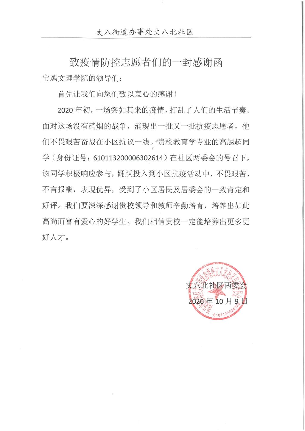 公司2018级教育学1班高越超同学在2020年5月份期间以抗击疫情志愿者身份积极参与西安市雁塔区丈八北社区疫情防控工作。他在工作中不畏艰苦、不言报酬的优异表现受到了社区居民和工作人员的充分肯定并特地向公司发来感谢信。
