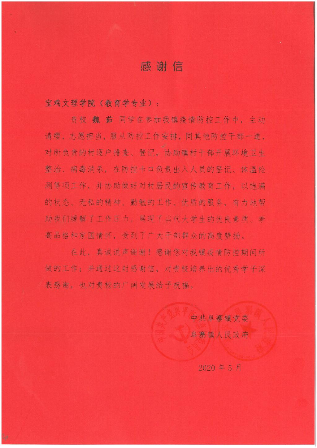 公司2019级教育学1班魏茹同学于2020年5月份期间在兴平市阜寨镇人民政府疫情防控工作中能够主动请缨,积极参与到重点人群排查、病毒消杀、体温测量、疫情防控知识宣传等工作,她以饱满的状态、无私的精神、勤勉的工作、优质的服务受到了当地政府的充分肯定并特地向公司发来感谢信。