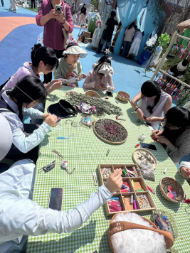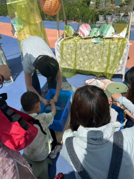 随后,同学们深度体验了端午游园会和童玩市集两大特色活动。在端午游园会中,通过非遗漆扇绘制、古法香囊制作、五彩扎染等传统游戏,同学们沉浸式感受民俗文化魅力,体悟中华优秀传统文化的传承脉络;童玩市集活动里,家长与幼儿的互动场景,生动展现了家园协同育人的温暖力量与教育成效。